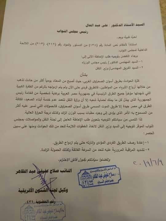 تقدم النائب صلاح عفيفى عضو مجلس النواب عن الدائرة الاولى بمحافظة اسوان بطلب احاطة للدكتور على عبدالعال رئيس مجلس النواب لتقديمة الى لجنة النقل و المواصلات لتوجية الى وزير النقل و المواصلات لاتخاذ الخطوات اللازمة نحو مشكل طريق اسوان القاهرة الغربى و الذى يلقب بطريق الموت بعد تعدد الحوادث بصورة يومية و متكررة و التى اودت بارواح العشرات من الابرياء من مستقلى هذا الطريق لقضاء اعمالهم و مصالحهم الشخصية سواء كان متجهين الى محافظة اسوان او الى محافظتي قنا و الاقصر حيث هذا الطريق يربط بين هذة المحافظات على اعتبارة هو الطريق الرئيسية لمرور عربات النقل الثقيل و سيارات الاجرة و الملاكى اختصارآ للوقت لقضاء مصالحهم و بعتبر هذا الطريق اطول الطرق مسافتآ يسير بها السيارات فى الاتجاهين دون ازدواجية حيث عرض الطريق لايتعدا ال 10 امتار بجانب تهالك الطريق و كثرت الحفر و المطبات وقد شملت طلب الاحاطة للنائب صلاح عفيفى على حلين كلاتى اولآ :- اعادة رصف الطريق الغربى الفردى و انارتة حتى يتم ازدواج الطريق ثانيآ :- تشديد المراقبة المرورية عليه للحد من السرعة الفائقة للسيارات وكذلك الحمولات الزائده